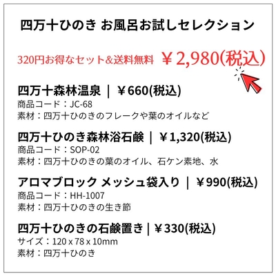 四万十ひのき お風呂お試しセレクション(お得なセット割引&送料無料!) 販売価格 2,980円(税込み) 会員価格 (税込み) 通常価格 3,300円(税込み) 在庫 商品コード FURO-01 JANコード 数量 - + カートに入れる ツイートする シェアする カテゴリー キャンペーンお得商品 個別送料 0円 RECOMMENDEDおすすめアイテム 桧のソープレスト 禅 Hinoki Soap Rest ZEN 2,420円(税込み) ジャパニーズ フォレスト スパ サシェ Japanese Forest Spa Sachet 605円(税込み) フォレスト シャワーソープ 石鹸置き付 Forest Shower Soap w/soap tray 1,650円(税込み) ジャパニーズ スパ(1袋入)Japanese Spa 605円(税込み) 四万十ひのき森林香 1,540円(税込み) 四万十ひのき森林浴石鹸 アルミ個装 1,320円(税込み) FOREST SHOWER SOAP アルミ個装 1,320円(税込み) 四万十森林温泉 Japanese Spa Japanese Label 660円(税込み) ジャパニーズ スパ Japanese Spa 660円(税込み) バスティー Bath Tea 660円(税込み) アースセイバー ソープレスト Earth Saver Soap Rest 1,210円(税込み) ソープレスト スクエア Soap Rest Square 1,210円(税込み) アロマブロック メッシュ袋入り 990円(税込み) ソープレスト Hinoki Soap Rest 1,210円(税込み) アロマブロック Bath Nugget 550円(税込み) ヒノキ温泉ソープレスト Hinoki Onsen Soap Rest 2,200円(税込み) 桧のアメニティトレイ 禅 3,850円(税込み) CATEGORYカテゴリー まな板 - Cutting Board キッチン - Kitchen Tools テーブルウェア バス - Bath Accessory 森の端材シリーズ キャンペーンお得商品 オンライン限定 - まな板 オンライン限定 - キッチン オンライン限定 - 小物 オンライン限定 - バス<Bath Accessory> オンライン限定 - 森の端材 オンライン限定 - 包装 CALENDARカレンダー 2025年11月 日 月 火 水 木 金 土 1 2 3 4 5 6 7 8 9 10 11 12 13 14 15 16 17 18 19 20 21 22 23 24 25 26 27 28 29 30 2025年12月 日 月 火 水 木 金 土 1 2 3 4 5 6 7 8 9 10 11 12 13 14 15 16 17 18 19 20 21 22 23 24 25 26 27 28 29 30 31 定休日