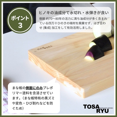 A3. 使用し始めた四万十ひのきのまな板(集成材)は、吸湿と乾燥を繰り返すたびに木目が伸び縮みをしているため、ヒビ割れなどが生じやすくなります。ヒビ割れなどを予防するには、次の予防策をお勧めします。